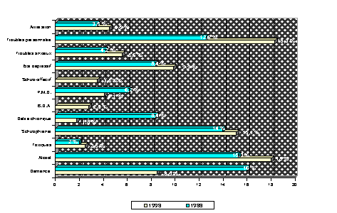 Mais les progrès scientifiques en pharmacologie, en génétique, en neurophysiologie, comme une meilleure compréhension de l'appareil psychique, reposent les éternelles questions. Les entités nosographiques explosent, s'interpénètrent, se recomposent, et pas seulement sous l'influence du D.S.M. On évoque des facteurs héréditaires communs de prédisposition à la PMD et la schizophrénie. (Ce qui n'est pas sans rappeler le concept de Monopsychose de ZELLER-NEUMANN et GRIESINGER au début du 19 siècle (1)). Les cliniciens sont frappés par la multiplication de formes hybrides, tronquées, que l'efficacité et la précocité des traitements mis en oeuvre ne peuvent expliquer qu'en partie. Nous nous sommes posé la question dans le service, d'une éventuelle modification, au fil du temps, de la répartition par diagnostic des patients ayant recours à une hospitalisation temps plein. Pour cela nous nous avons comparé la population hospitalisée en 1988 et 1998 en regroupant les grandes catégories de la CIM 1O.