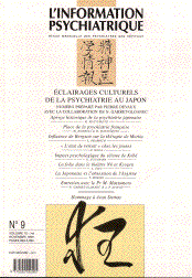 Vient de paraître (janv 2000): un N° exceptionnel par sa qualité de présentation, son théme et sa composition de L'Information psychiatrique N°9 vol 75 nov. 1999 Présenté et préparé par "le filtre d'un littéraire", P. Devaux musicien, professeur agrégé de littérature à Kobé depuis 1979 Préparé par N. Garret-Gloanec dans le respect des traditions culturelles nippones profondes (au delà des mondialisations des discours psychiatriques) Illustré par le maître en calligaphie Hôsui Décidemment les choix de l'Information psychiatrique honorent la psychiatrie française par son refus du langage psychiatrique universel tout en montrant la place éminente qu'occupe Henri Ey dans les études et la culture psychiatrique nippone. |