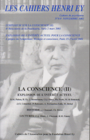 Symposium sur La Conscience II J.Cl. Colombel : Eveil et conscience: dans un jardin perdu. R.M. Palem : La prise de conscience du point de vue du psychologue. P. Belzeaux : La prise de conscience, entre le Sujet et la Personne. Ey, Lagache, Lacan. M. de Boucaud : Conscience du trouble, conscience du temps: la dynamique du Sujet